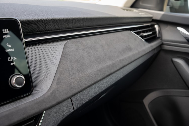 新Kamiq內裝上採用滾橘色縫線的 Suedia/真皮混搭包覆座椅,Suedia 材質的飾板與門邊飾板搭配高質感銀色飾條也營造內斂沉穩的質感與氛圍。