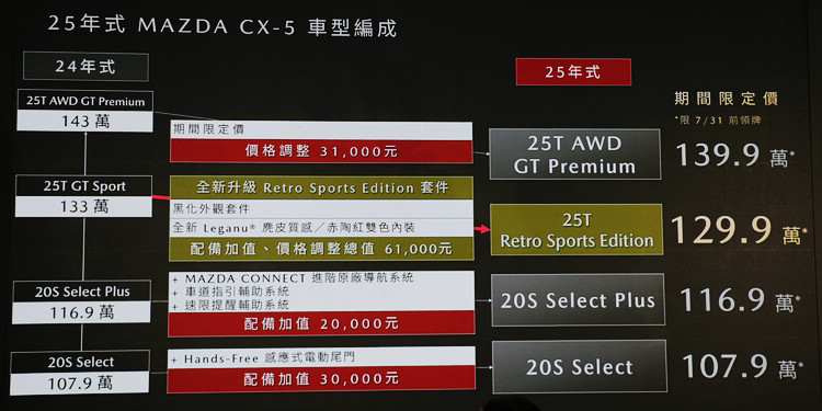 CX-5 (售價皆為7月底前入主限定)![]() 25 年式CX-5入門車型 20S Select升級 Hands-free 感應式電動尾門,售價107.9 萬元(維持不變)。