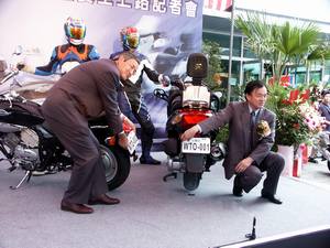 ▲由交通部次長蔡堆(左)與光陽工業總經理王雙慶(右)共同完成KYMCO三新車的掛牌儀式根據經濟部預估,台灣每年約有二萬台重型機車市場之需求量,每年市場規模約在30至40億元之間,同時將成為國內外機車業者兵家必爭之地;而重型機車的開放,消費者的選擇將更多樣化,勢必改變傳統車業生態與民眾休閒習慣。為因應此一險峻之挑戰與WTO叩關之影響,光陽已做好萬全準備,除新發表之三款新車外,後續將發表其他「大型重型機車」,同時光陽將藉由更多元的產品與高品質的服務迎戰進口機車。未來光陽更將積極降低生產成本、提高市場競爭力、並透過與國外總代理合作的方式,積極拓展全球外銷市場。