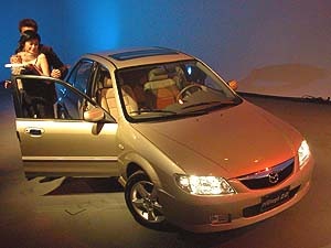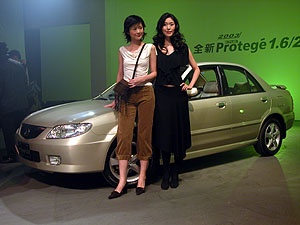 ![]() ▲車頂高度只及模特兒腰部位置,是車子矮嗎?不!是模特兒身高6尺外加高跟鞋。MAZDA 323 Protégé 2003全新仕樣車在安全方面表現亦不惶多讓。MAZDA 獨家的MAGMA 3H 超剛性車體結構與車側強化四門防撞護樑,三面(車頂、車側、車底)H型結構及前後吸震區設計,確實提供駕駛者與車內乘客最妥善的保護;四輪液壓雙迴路碟煞系統與ABS、EBD電子煞車力分配系統,2.0車型更配備PATS晶片防盜系統,讓323 Protégé的車主同時享受暢快駕馭與安全無虞的完美感受。