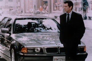 ![]() ▲在007第18集『明日帝國』中,龐德曾駕駛著BMW 750iL,力戰其他品牌的德系群雄。提到007和BMW這樣的組合,『縱橫天下』已不是第一遭。007系列電影向來就一直很強調汽車的存在(畢竟,對大部份的男性朋友來說,香車、名酒與美人是很難抗拒得了的吸引,而007的存在,就是提供各位男士一個情感上的印象投射),早在83年上映的007第13集『八爪女』(Octopussy)中,當時還是由羅傑•摩爾(Roger Moore)扮演的007就已曾駕駛過BMW 5系列與重型機車在影片中奔馳。然而,BMW車真正在電影中擔任較吃重角色的,還是從第17集的『黃金眼』(Golden Eye)開始,首次擔任007角色的現任男主角皮爾斯•布洛斯南(Pierce Brosnan)就駕駛了一輛當時還未正式量產的BMW全新敞篷小跑車Z3出現在電影中。而在隨後的『明日帝國』(Tomorrow Never Dies)中,龐德又駕駛著能夠由ERICSSON概念行動電話遙控的特製BMW 750iL,在法蘭克福市的停車場中和一干由壞人所駕駛的德系對手車輛(例如舊型的MERCEDES-BENZ W104 S-Class及OPEL Senator等)對抗。透過電影情節,我們很容易地就能看到車廠想要強調新車所擁有的特色,例如強大的性能表現、高超的操控能力以及堅實的撞擊防護能力等,而自動充氣輪胎、遙控導航這一類原本是由電影人所杜撰出來的虛構叫lash;能,其實也實際被汽車工業吸收討論,或連lash;在不久的將來就會出現在現實生活的車輛中也說不定(當然,像發射火箭、釋放三角釘或隱藏式電鋸這一類的玩意兒,應該是日常生活中不該會用到的配備項目吧!)