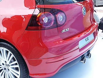 在外觀上,全新R32擁有專屬的鋁合金鑲缀的水箱護罩,讓人能夠立即辨識出他的身分。特別的是,水箱護罩下方由雙氙氣頭燈所構成的下緣,顯示出由傳統跑車大幅轉變而來的造型。水箱護罩上方水平的雙層類鋁合金橫柵,則構成了R32的主要元素。在水箱護罩的兩側,兩個額外的大型進氣口滿足了空氣的供應。此外,保險桿下緣也與車體同色烤漆,兩側也都有導流元件,線條一路延伸到側裙和後保險桿。車尾的部份,R32的後保桿同樣採用與車身同色烤漆塗裝設計,只有在中間擾流板的部份維持黑色。兩支圓形的排氣尾管,以拋光不鏽鋼材質製作,相互緊鄰而安置於中央部位,以營造出衝擊性的視覺特色。從側面觀看R32,18吋的鋁合金輪圈,20幅條的設計,專屬R32的藍色煞車卡鉗,在鋁圈內清晰可見。卡鉗在你踩下煞車踏板時,牢牢的抓住前方345mm直徑以及後方310mm直徑的大型碟盤。225/40R 18的高速跑胎,擁有Y型設計的胎紋,能承受300km/h的速度。大型的車尾擾流翼,保障後輪能夠隨時與路面緊貼。特別調教過的跑車化配備,包括了降低20mm的懸吊系統,以及18吋的鋁圈尺碼,在安裝輪胎的空間裡構成了最完美的胎圈比例。整體來說,全新R32在外觀上展現了跑車的霸氣,再加上R32專屬的設計,讓全新R32成為一部辨識度極高,獨一無二的跑車旗艦。