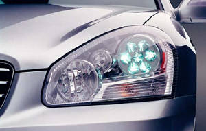 ![]() ▲『複眼式』HID頭燈是Q45上最出色的創新點之一,使用此系統後就不再需要分離的霧燈配置。新車款在其他的機械設計方面,VDC(Vehicle Dynamic Control)車身動態控制系統將列為選用配備,而TCS、ABS、電子煞力分佈及速度感應式轉向機構則為標準配備。新車款使用全新設計的四輪獨立多連桿懸吊,標準配備17吋、可以選用18吋的大尺碼合金輪圈。在車室內的設計上,Q45的儀表控台採用了駕駛人導向的佈設方式環繞在駕駛座旁,中控台上可以見到七吋尺碼的大型液晶螢幕,除了播放DVD與NISSAN自豪的『鳥瞰』(Bird View)式導航地圖外,也可利用車尾的監視器在倒車時監控後方的狀況。除此之外Q45上的一些重要配備還包括像左右恆溫空調,288瓦/八聲道的BOSE音響系統,以及對手LEXUS LS400早已率先使用的智慧型定速巡航系統,利用車頭的雷達裝置探測與前方車輛間的相對距離,適當地調整車輛巡航的速率。然而,若從車外觀察Q45,其實最明顯的改變重點應該是全新登場的『複眼式』HID頭燈,在其頭燈反射鏡內我們可以見到七個獨立的氙氣放電燈泡取代了傳統的單一燈泡設計,由於七個燈泡的組合這套系統可以搭配任何造型的外部燈殼,也不再需要獨立出來的分離式霧燈之配置,讓Q45擁有傲世全球的照明表現。