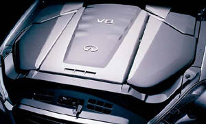 ![]() ▲Q45上搭載的4.5升引擎可以說是I30上那具大受好評的VQ30DE之八缸版本,340hp的強大動力讓Q45擁有低於六秒的驚人加速成績。此次新車款改變的重點,主要都集中在動力系統的精進上。為了強調品牌旗下的車款較為運動風格的特性,近年來日產積極以INFINITI的名號參與在美國地區非常風行的IRL(Indycar Racing League)賽事,成為主力的引擎供應商之一,而旗艦Q45自然也不會忘記此點,其引擎部份特別委由車廠內負責IRL引擎開發的小組來調校設定。雖然車名仍稱為Q45,但實際上現行(第二代)的Q45使用的是一具排氣量4.1升的V-8引擎(VH41DE),而在改款的過程中引擎排氣量再度提昇回初代車款時的4.5升。然而,值得注意的是這具引擎並非以上代車款的動力系統直接改良而成,而是以同廠較入門的車款I30(也就是國人所熟悉的NISSAN Maxima之INFINITI版本)上那具3.0升的V-6(VQ30DE)引擎加以改良而成之八缸版本,雖然同樣是採DOHC每缸四氣門設計,然而VQ系列的引擎在機械設計方面較就款引擎先進連lash;多,也曾獲過多項工程設計獎項,擁有模組化的汽缸頭,輕量化活塞,可變氣門正時,可變進氣歧管長度及鈦合金氣門等新設計。新引擎在IRL動力小組的改良下擁有高達340hp的動力輸出,以及46.1kgm的充沛扭力輸出,配合具有手動換檔模式、鋸齒狀檔位佈設的五速自排變速箱,新Q45能夠在5.9秒內自靜止加速到96km/h,較上代車款足足快了兩秒,也令連lash;多真正的性能取向跑車汗顏。