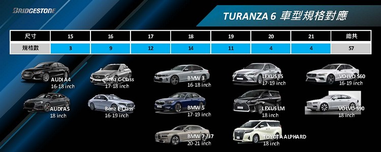源自於日本,全球最大輪胎品牌之一的普利司通(BRIDGESTONE)於今(11)日隆重推出專為高級房車市場設計的 TURANZA 6 高性能輪胎。全系列涵蓋 15吋至21吋、共 57 種規格,自即日起首發8個主流規格,其他規格會在三月後陸續上市供應,適用於高級房市場的主流品牌與車型,滿足駕駛者對高性能與舒適性的雙重需求。