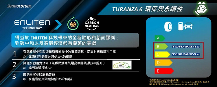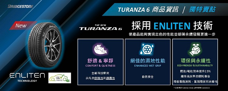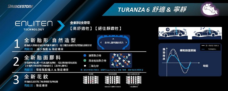 TURANZA 6 的全新胎形設計,建立了輪胎在使用時靈活且理想的輪胎形變和接地形狀。除此之外,全新的胎面膠料融合了不同功能的奈米級聚合物,提供優異的磨耗壽命,相較前一代產品更加柔軟,且降低了輪胎的滾動阻力、製造消耗和重量,提升了行駛中的舒適度和靈活度。