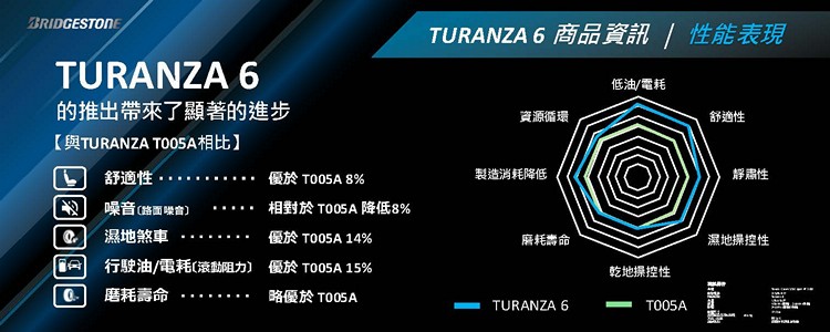 普利司通 TURANZA6同時兼顧電動車的需求而設計,其低滾動阻力可延長電池續航,緩解里程焦慮。此外,其優化的耐磨性能可有效應對電動車較高的重量與扭矩。而降噪技術則能進一步提升駕駛舒適度,與電動車本身近乎無聲的運行特性相輔相成。這些特點讓普利司通 TURANZA 6 成為比前代更全面的輪胎,為所有乘用車提供卓越的性能與舒適性。TURANZA 6 vs. T005A:五大性能全面進化根據實測數據顯示,TURANZA 6在多項關鍵性能上皆優於前代T005A,具體提升如下: 1. 在舒適性方面提升了8%,提供更平穩的行車體驗。 2. 路面噪音相較 T005A 降低8%,增強靜謐性。 3. 在濕地煞車方面,優於T005A14%,展現更佳的濕地操控與濕地抓地力。 4.在行駛油/電耗表現上,TURANZA 6兼顧燃油車和電動車的日常使用,較T005A 提升了能源效率。 5.磨耗壽命也優於T005A。
