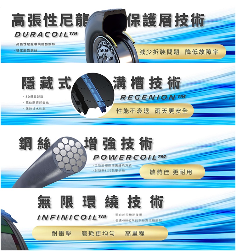 針對長途運輸的高里程需求,X Multi Energy 2採用無限環繞技術與鋼絲增強技術,增加胎體強度及胎面的耐久性,確保各式路況下對車輛的穩定控制,也保持優異的行駛里程,降低輪胎更換頻率。至於隱藏式溝槽技術則讓輪胎能在磨耗後產生新的隱藏式排水花紋,確保各種天候下的安全行駛。