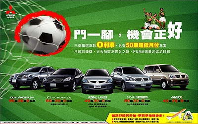 2006年度體壇盛事~世界盃足球賽即將於6月開打,全球將有32個國家參賽、超過20億人口關注這場賽事,世足潮流即將席捲全球。為持續回饋消費者、降低購車負擔,並邀請消費者一同感受世足熱潮,中華三菱特別規劃「0門一腳」專案,除旗下精選車款享有0利率購車優惠,以及選擇50期超低月付專案外,本月底前領牌,還可參加「天天抽世足歐洲之旅、PUMA限量迷你足球組」抽獎活動,有機會前往歐洲旅遊及獲得世足限量精品。另外,中華三菱 5230網站(www.5230.com.tw)亦將舉辦「0門一腳」挑戰賽,成功者就有機會獲得2006比利限量紀念鞋。