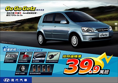 今年車市雖然不景氣,但是對於許多預算型的消費者來說,卻是最佳的入主時機,擁有國產小車中最具歐式美感與設計的HYUNDAI Getz,近期推出了Go Go Getz限量精裝專案,讓您用不到40萬的售價可以享受這輛最佳國產歐風小車!