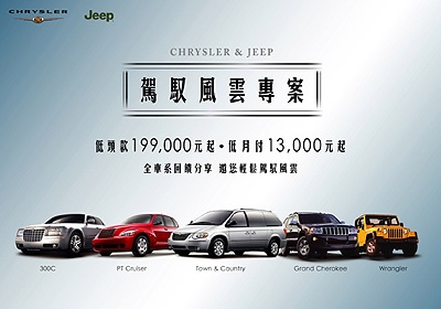 台灣克萊斯勒慶祝Chrysler Town & Country休旅旗艦獲評為車訊風雲獎2006年最佳國產MPV,推出Chrysler & Jeep全車系「駕馭風雲專案」。十二月份是購車好時機,Chrysler及Jeep全車系享有低頭款、低月付的輕鬆付款方案,進口車(300C、PT Cruiser及Jeep)還能享有5%現金折扣。申辦貸款成功再送強制險。