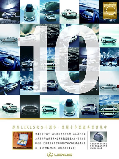 LEXUS國內總代理之和泰汽車,為慶祝LEXUS在台上市十週年,自即日起至11月底止,推出榮耀十年典藏專案。活動由購車至售後服務,皆推出一系列優惠措施,以答謝十年來國內客戶對LEXUS的愛顧。