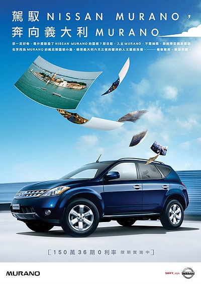 ![]() 承襲小島的精神,「Sculpture in Motion- 移動中的雕塑」是NISSAN MURANO設計概念的出發點,在動靜之間都彷彿一件優美的雕塑品。裕隆日產汽車表示,除了要讓MURANO車主擁有造型優美、X-CVT優異操駕樂趣的車型,更要讓每位入主MURANO的新車主,都能夠親臨這座義大利小島,深度探訪其藝術氛圍並感受激發NISSAN MURANO的靈感來源。本月份只要購買NISSAN MURANO,不需抽獎,即贈送義大利六天三夜自由行,讓每位MURANO的新車主都能夠親身探訪義大利Murano藝術小島的人文藝術風情。
