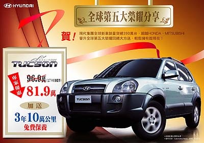 油價漲、電價漲、天然氣也要漲,最近國人見面頻率最高的問候語,就是時下民生物價指數不斷高漲的議題。不過在漲、漲、漲、漲聲不斷的同時,三陽現代汽車為慶祝現代汽車集團全球新車年銷售量突破390萬輛的新高記錄,躍升成為全球第五大汽車廠,及體認民生物價指數的上揚,不僅積極思考如何在回歸日常生活基本面上,推出可以各款可以節碳、省能的車款外,更在繼6月推出『LG家電千萬好禮三重送』回饋活動,受到社會大眾的支持及熱烈反應之後,在9月現代汽車再積極推出「全球第五大;榮耀分享專案」,讓現代汽車的支持者與顧客共體時艱及有機會分享喜悅。