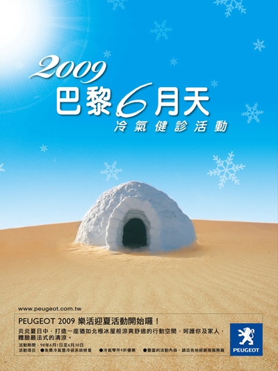 「巴黎6月天」冷氣健診活動於2009年6月1日至6月30日為PEUGEOT獅友們展開清涼的樂活服務行動,另外,活動期間內回廠車主,即可以超優惠價格收藏多款超人氣精品,數量有限售完為止。為節省車主寶貴的時間,請多加利用服務廠的預約專線,事先安排服務時間,讓PEUGEOT全省服務團隊為車主提供最優質的服務。欲知活動詳情,請速洽全省PEUGEOT經銷商服務廠或透過網路www.peugeot.com.tw、顧客服務專線0800-207-307與我們聯絡。