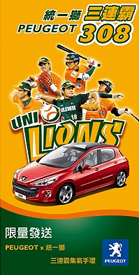 統一獅繼去年蟬聯總冠軍後,職棒20年自開賽以來,即以旺盛的氣勢順利取得上半球季冠軍,並獲得全年球季勝率第一,將與下半季冠軍 – 兄弟象決戰總冠軍,期望完成三連霸的盛業。此次,PEUGEOT總代理 寶嘉聯合將以省油獅王PEUGEOT 308為統一獅加油,發揮 “雙獅相挺” 最大效益外,更將以308 = 三連霸的諧音為統一獅的奪冠之戰集氣。