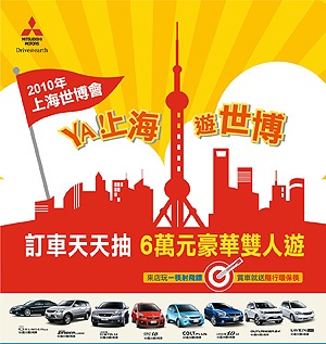 根據台灣經濟研究中心發布消費者信心指數指出,2月份指數創下51月以來新高,其中「未來半年購買耐久性財貨時機」指數更是突破100點,消費者購屋買車的信心回升,MITSUBISHI MOTORS趁勢推出「訂車天天抽上海世博6萬元豪華雙人遊」活動,只要在3月底前訂車並領牌MITSUBISHI全車系(不含商車)就可能抽中2010全球最大盛宴—上海世博6萬元豪華雙人遊,越早購車中獎機率越高,想要感受YA!上海,遊世博的消費者千萬不要錯過僅此一次的活動機會喔!