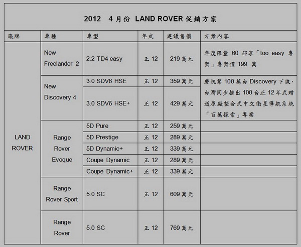 延續2011年立下的銷售紀錄,2012年LAND ROVER台灣總代理九和汽車於再度獲得年度總配額限量60部「too easy專案」與台灣車迷分享,讓原定價219萬元的Freelander 2能以超高C/P值的199萬元即可輕鬆上手,讓Freelander 2 easy成為國內唯一200萬元以下的歐系4WD LSUV車款!