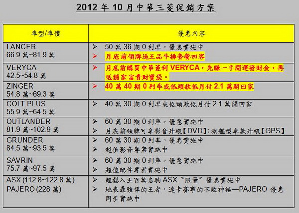 為照顧廣大的商用車頭家,再加碼推出中華菱利「有利卡好」優惠購車方案,凡十月底前購買中華菱利VERYCA,不僅讓您先賺開運發財金,再送獨家富貴財寶袋,乎您買車賺大錢。此外,MITSUBISHI ZINGER 10月也將加入「低頭款、低月付2.1萬開回家」優惠專案,讓頭家輕鬆買、輕鬆賺。