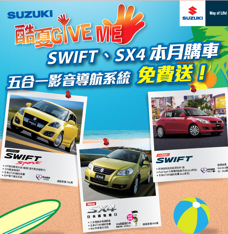 SUZUKI於7月份多種車款持續推出好康專案,熱門車款SWIFT GLX/GL,SX4,及SWIFT SPORT 免費送5合一影音導航系統。輕巧可愛的ALTO則有低頭款3.8萬月付9,999起專案。