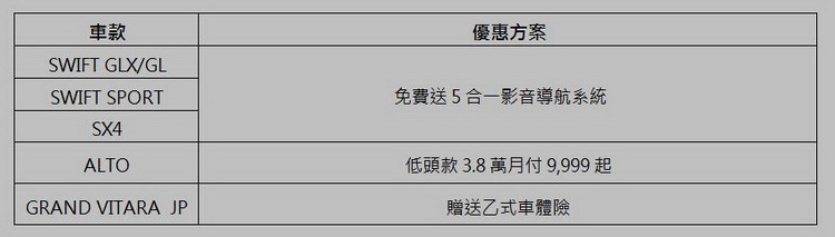 而GRAND VITARA JP 擁有4WD極限血統車款也在本月推出購車領牌就送乙式車體險方案。歡迎喜愛SUZUKI 的朋友們至全省各大經銷點洽詢,免付費服務專線:0800-098-345。或上SUZUKI 官方網站www.taiwansuzuki.com.tw查詢。