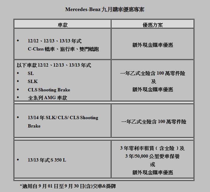 ![]() 另外,特別針對旗下 C-Class 推出超值優惠方案,讓您輕鬆擁有社會菁英最愛入門車款,體驗三芒星的超凡魅力!凡購買12/12、12/13、13/13 年式C-Class 轎車、旅行車或雙門轎跑車款,凡是在九月份完成交車、掛牌者,即享有額外現金購車優惠,現在擁有賓士C-Class不再是遙不可及的夢想。
