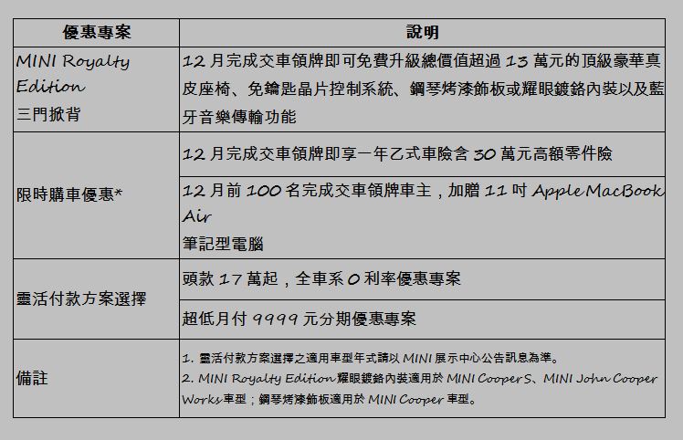 ![]() 而為了讓更多MINI Fans可以輕鬆實現擁有MINI的夢想,凡於年底前入主,即可享一年乙式全險含30萬高額零件險;前100名入主MINI車主更可獲得11吋Apple MacBook Air筆記型電腦;超低月付9,999元分期優惠專案也同步實施中。