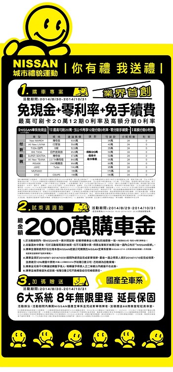 為呼應城市禮貌運動,NISSAN即日起推出「你有禮我送禮」活動,即日起至10月31日止,消費者凡刷卡購車,即可享有業界首創「免現金、零利率、零手續費」超值優惠,最高可刷20萬元,並搭配高額分期零利率專案,玉山卡再享12期分期零利率、零分期手續費優惠,NISSAN國產全車系加碼再贈送六大系統八年無限里程延長保固,四門大TIIDA 1.6L及NEW MARCH車系除享以上優惠外,更免費升級LDWS車道偏移警示系統與SMART HUD行車安全顯示系統。進口車部分, ROGUE、MURANO及JUKE TURBO版,除同享「你有禮我送禮」活動優惠外,更贈送總價值超過10萬元的六年失竊保障大禮。