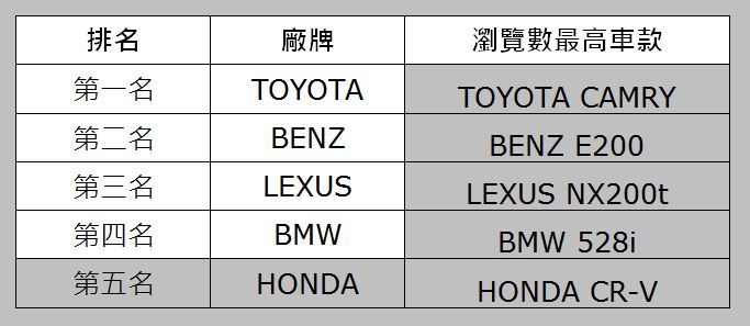 據abc好車網統計,2018年熱門廠牌前五名分別為TOYOTA、Mercedes-Benz、BMW、LEXUS、HONDA,熱搜榜首雖然由國產龍頭TOYOTA奪下,但進口豪華品牌也包辦了第二、三、四名,且站上更有超過4成用戶都在找LEXUS和雙B車,其中又以BENZ E200、LEXUS NX200t、BMW 528i最為熱門。