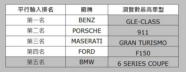 另外,從abc好車網大數據發現平行輸入車(或稱外匯車,意指從國外進口的中古車或里程數極低的展售車),以優惠車價、特殊車款及履歷清楚等特色吸睛,每台瀏覽數更是全站平均的5倍以上,其中像台灣未引進的FORD F150美式皮卡每台更有超過1萬次瀏覽,顯示近年來消費者對於平行輸入市場的高度需求及興趣,所以abc好車網也特別設置abc百大平輸好店,提供六大安心保證,除了前述好店的三大保證外,更額外保證車源皆有完整第三方履歷、半年售後五千元免費維修*5等保障,abc好車網作為嚴格把關優質平行輸入貿易商與車源的最佳守門員,讓民眾能放心在站上盡情選購高CP值的平行輸入車。
