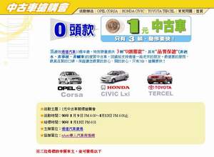 積極經營中古車市場的eAuto(www.eauto.com.tw)華人汽車商情網,與知名的中古車商通達汽車廣場,在 本 月 9 日下午2點,舉辦國內首創的「 一元中古車競標搶購會」。此活動除了一元起標為最大特色外,另外更提供零頭款、車源品質、3個月(5000公里)保固三大保證,以及一年20公里免費道路救援等保障。
