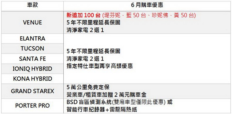 品牌旗下超新星,同時是市場最夯的小型休旅 VENUE ,5月推出亮眼的超顯色限定系列迅速搶訂一空,兩款「堤芬妮.藍」與「珍妮佛.黃」新色外觀內裝時尚又優雅,搭配高顏值與高CP值吸引力,獲得廣大女性車主熱烈回響。本月緊急再追加增產100台,珍藏稀有VENUE超顯色只要70.9萬起。