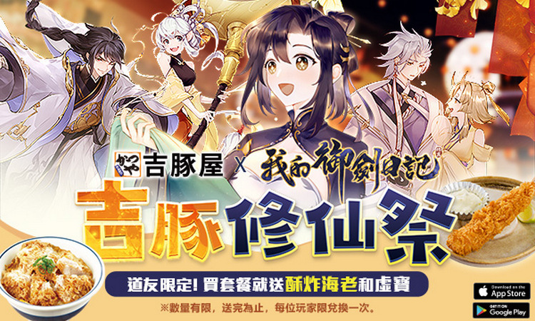 而吉豚屋與我的御劍日記合作,推出「吉豚修仙祭」,即日起至2/28購買吉豚屋「腰內系列餐點」,包含腰內豬排丼、腰內豬排定食、海老腰內豬排丼、海老腰內豬排定食4款指定餐點,即可獲得《我的御劍日記》遊戲虛寶卡一張,若出示《我的御劍日記》遊戲畫面再送酥炸海老一尾。