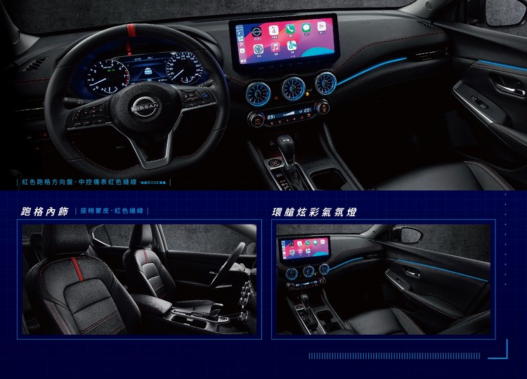 NISSAN SENTRA「黑化雙生版」提供冷傲白、冷傲白搭配黯夜黑頂及疾風藍搭配黯夜黑頂3種車色,外觀升級5項配備,包含閃爍非凡銳利眼神的「藍紋頭燈」、夜晚中獨領風騷的「藍翼迎賓光流照地燈」,再搭配「全新黑化水箱護罩」、「黑化保桿飾條」、「黑化鋁合金輪圈」,營造出與眾不同的個性化外觀,成為街道上的目光焦點。內裝則限量升級3項配備,包含內建7種色彩顏色、可手動調控燈光大小及色彩變換的「環艙炫彩氣氛燈」、營造車內運動化氛圍的「紅色方向盤定位標」,及搭配熱血「紅色座椅縫線」,整體內裝更顯濃烈跑格。