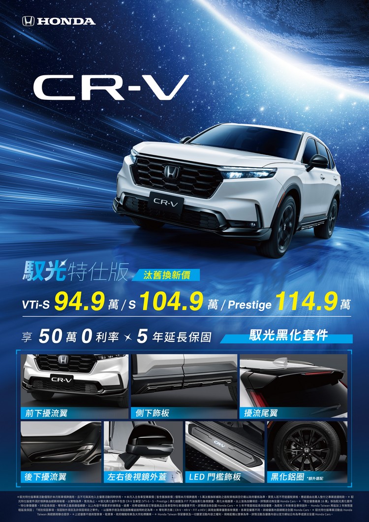 即日起~12/31止入主HR-V全車型限量免費升級「馭光特仕版」黑化套件組,包含「前下空力保桿、後下飾板、側下飾板、LED門檻飾板含氣氛燈、左右後視鏡外蓋」,另享有「50萬0利率」、「5年延長保固」優惠好禮。HR-V S+ 再享汰舊換新價73.9萬元、Prestige 79.9萬元的限時優惠,讓消費者輕鬆擁有獨樹一格的都會CROSSOVER跨界跑旅,體驗無與倫比的駕駛樂趣。