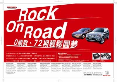 Honda自重返台灣汽車市場以來,一切的經營作為都以顧客的立場作為出發原點,不論是買車前為顧客創造最大的品牌值;或是在買車過程中提供顧客輕鬆的購車方式、公平透明化的交易條件、充分的試乘體驗以及專業的人員的解說等;甚至是買車後更提供專業快速的售後服務、三年或十萬公里保固,以及最佳的中古車保值性等,可說在在都是為了替顧客創造最貼心、安心及信賴的整體優質購車環境。為讓更多的消費者可以輕鬆感受到Honda那份對顧客滿意的堅持與用心,Honda特別自7月1日起至8月4日止推出“Rock On Road”輕鬆圓夢購車活動。