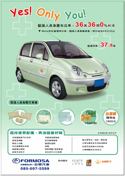 視覺系小車Matiz自上市以來,即以幽默詼諧兼具無厘頭的廣告表現建立獨特形象,風格各異的多樣車款及特仕車,更完整建構出Matiz時尚教主的本色。年前台朔汽車與開啟兩岸三地繪本風潮的知名繪本作家--幾米首度合作,推出Matiz「布瓜特仕車」後,旋即引起廣大消費者的高度認同並創造無數的銷售佳績,為回饋大家的熱愛,今年夏天再度推出『Matiz布瓜醫護特仕車』!