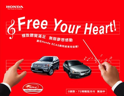 Honda這次所推出的“Free Your Heart”輕鬆購車專案,是為了讓更多的消費者可以享受到Honda為顧客創造的貼心購車環境之其中一環。除了為消費者精心規劃的專屬劇院級車用音響好禮外,Honda特別規劃了0頭款加上72期的低利月付方案,讓消費者能享有降低每月分期付款金額的壓力,真正達成輕鬆購車的目的,也可以作出其他理財規劃,讓更多消費者可以一圓擁有Honda的美夢。