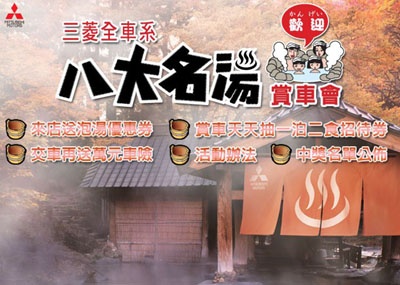 ![]() 近年來國人泡湯的風氣日盛,尤其入冬後低溫持續發威,不少民眾都想體驗泡湯樂趣;不過泡湯雖然開心,水質、安全泡湯地點都是行前需注意的;所以中華三菱選出口碑品質俱佳、泉質各具特色的烏來、金山、谷關、礁溪、六龜、關子嶺、知本溫泉,並與當地優良業者合作,消費者只要憑著中華三菱致贈的優惠券,一家四口都可享有五折泡湯優惠。另外,中華三菱天天抽出八大名湯全家四人一泊二食的招待券(每天每湯一名),抽獎資格至活動結束日前都有效,越早賞車中獎機會越大。詳情速洽中華三菱展示中心,或至5230網站了解活動辦法。
