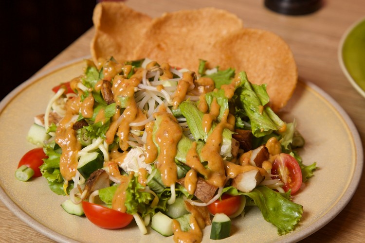 印尼家常沙拉,以多種蔬菜、豆腐與水煮蛋搭配濃郁花生醬,清爽開胃、口感豐富。