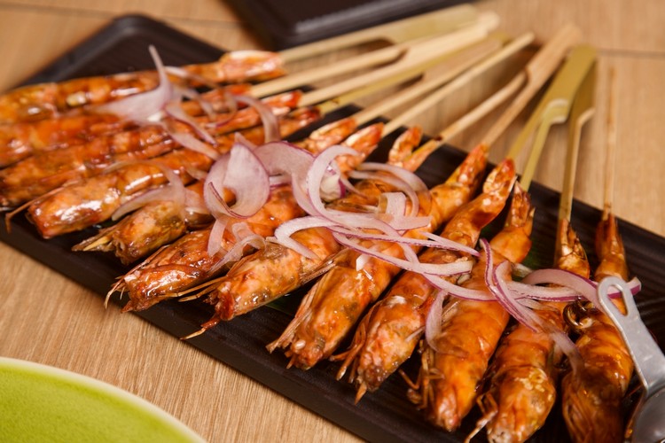 新鮮白蝦以香料醃製,炭烤後搭配金桔醬與辣椒醬,展現海味與香氣的完美結合。