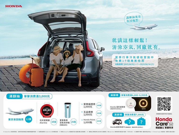 Honda Taiwan自2025年6月2日至2025年8月16日舉辦Honda Care +「就該這樣輕鬆!清涼空氣,回廠就有」活動。我們誠摯邀請車主預約回廠,即享免費17項行車安全健檢服務。