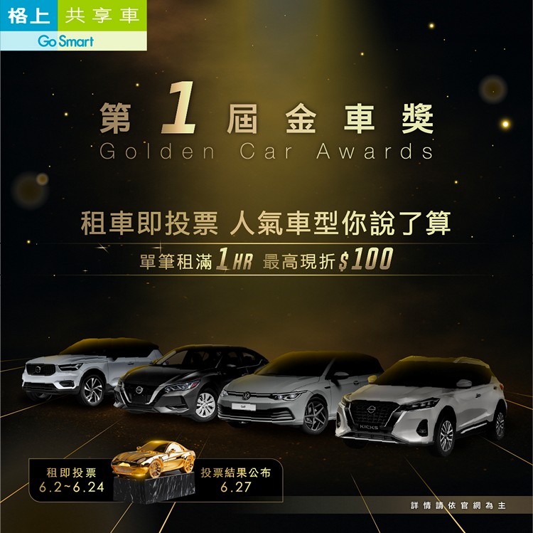 共享汽車市場擁有最多元車款的格上Go Smart,舉行第1屆「金車獎」,共有3大獎項-年度風雲車款獎、最佳新車款獎以及最佳城市通勤車獎,入圍名單正式公布!共有9款車型入選,包含Nissan New Sentra、福斯Golf、VOLVO XC40、MG ZS、三菱Eclipse Cross、VOLVO XC40(純電)、Nissan iTIIDA、Honda Fit、Nissan Kicks。即日起至6月24日,消費者租用入圍車型可享當筆租金折抵優惠,平日可用百元價開進口車。同時也為您心中最佳座駕投下一票,活動結束後中選的贏家車款,格上Go Smart將推出加碼優惠,快來參加選出跑得最順、最有聲有色的車款。