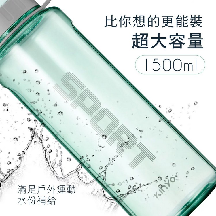 203g超輕量運動水瓶,1500ml大容量也推薦給辦公室久坐的上班族使用。高韌性耐摔材質,便攜式提手輕鬆攜帶無負擔,密封矽膠圈完全防漏。5.5公分超大口徑清潔更乾淨!