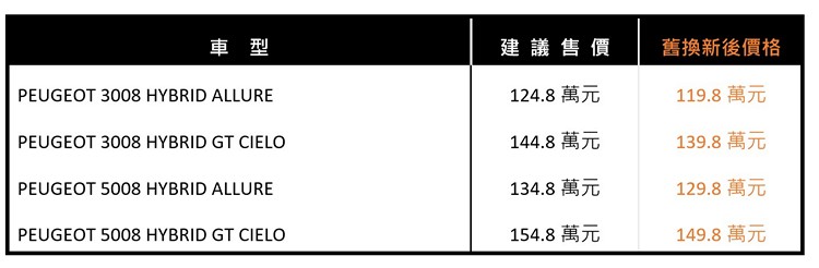 PEUGEOT 3008 HYBRID以全新歐洲進口油電休旅,搭配最新底盤平台、全新HYBRID油電科技、領先同級的星際座艙設計,搭配政府舊換新政策的補助後,只要新台幣119.8 萬元起即可入手,強勢挑戰國產休旅車款的價格帶,展現同級罕見的超強產品實力。