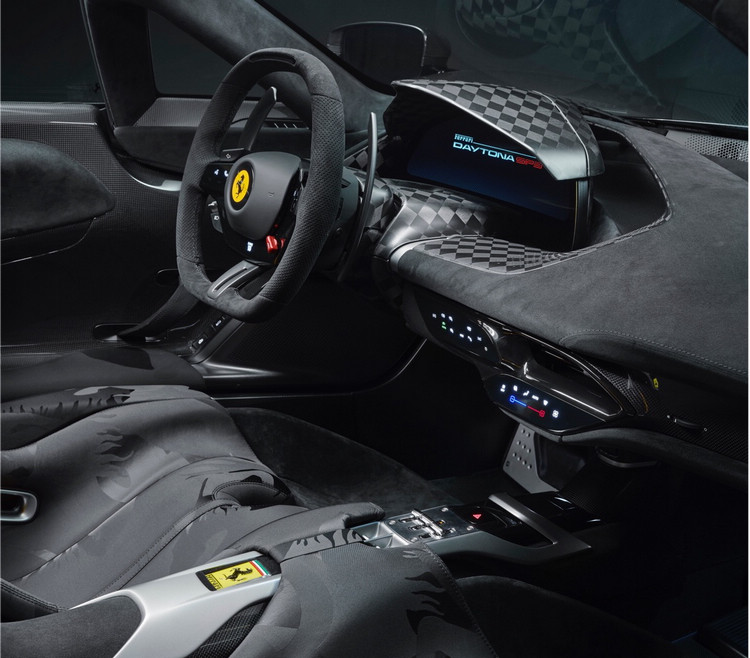 特別版Ferrari Daytona SP3車身上部橫貫的Giallo Modena色「Ferrari」字樣更成為點睛之筆,此標識亦是 Ferrari 首度將品牌字樣作為車身塗裝設計的一部分。內裝選用以再生輪胎製成的創新環保織材,飾有專屬躍馬圖騰。儀表板與方向機柱則使用源自 F1 賽車技術的碳纖維材質,進一步彰顯車輛與 Ferrari 賽道基因的緊密連結。