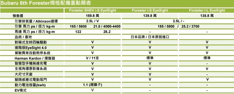 SHEV i-S EyeSight:預售價159.8萬元![]() ▲Subaru全新第六代Forester即將正式登場,共導入汽油i-L EyeSight、i-S EyeSight與SHEV i-S EyeSight等三款車型配置,即日起以135.8萬起接單預售。SHEV i-S EyeSight為全新第六代Forester陣容中的唯一採用油電複合動力的車型,搭載2.5L Atkinson引擎與鋰離子電池組(1.1kWh),具備獨特的EV模式,提供更高的燃油效率與低速行駛時的靜謐體驗。雖然引擎最大馬力165ps的輸出略低於燃油車型,但透過油電混合輛技術的加持下,其性能發揮不僅以節能與平順舒適為主要考量,強勁的電能扭力輸出更賦予SHEV i-S EyeSight充沛的加速動能,不只節能、也更性能。 ![]() ▲Forester i-S EyeSight 的座椅同樣具備前座電調、加熱與記憶功能,11.6吋的多功能螢幕滿足日常所需的影音娛樂。