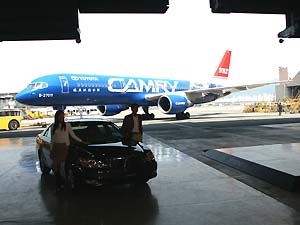 終於在3月10日,破天荒的在松山機場遠東機棚舉辦TOYOTA Camry的上市發表會,真的又是一項前無古人的行銷創舉,所以整個發表會的過程不時會聽到噴射客機、螺旋槳機、直昇機的起降噪音,這還真是前所未有的經驗啊。在和泰汽車冗長的介紹完後,突然布幕一拉開,什麼都看不到,然後現場的喇叭開始響起飛機的發動機運轉噪音,遠方一架藍色機身的波音757-200被緩緩的拖進發表會現場,在快要撞上機棚時,來個90度右轉,開始看到在機側的巨大CAMRY字樣,然後又看到機尾上的Camry車頭,等到波音757-200客機就定位之後,Camry才一部部的出現,完成這次在機場舉辦汽車發表會的創舉。