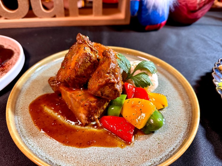延續這份濃郁香氣,「密蘇里黑角焦糖烤牛肉」以牛胸肉作主角,透過烘烤讓表層焦糖化,香氣飽滿、風味層次清晰。這是一道經典的密蘇里烤肉館風格料理,鹹甜交織、外酥內嫩、內裡保有肉汁,是啤酒愛好者最難抗拒的肉食誘惑。