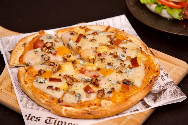 湯品部分,主廚特別打造「密蘇里巧達濃湯麵包盅」。以乳酪、培根與蔬菜熬成巧達濃湯,盛入烤得金黃的麵包碗中,香氣四溢。酥脆外皮吸附湯汁後的口感,是最典型的美式暖胃慰藉。接下來登場的「聖路易風綜合起司堅果披薩」,靈感來自密蘇里最大城市——聖路易。主廚選用美式薄底餅皮,鋪上多種起司,並加入香味獨特的黑核桃,讓濃郁奶香與深邃堅果香交織,風味層次更加立體。薄脆餅皮承載著滿溢的香氣,是最容易讓人不自覺多拿一片的美式經典風味。